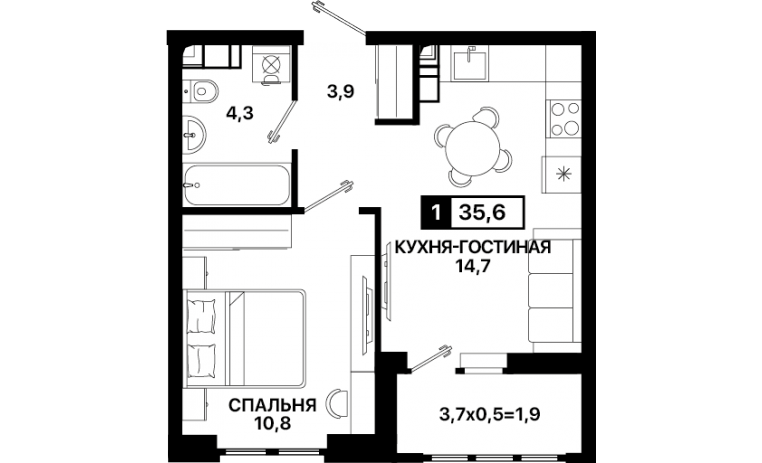1-комнатная квартира 35,6 м2