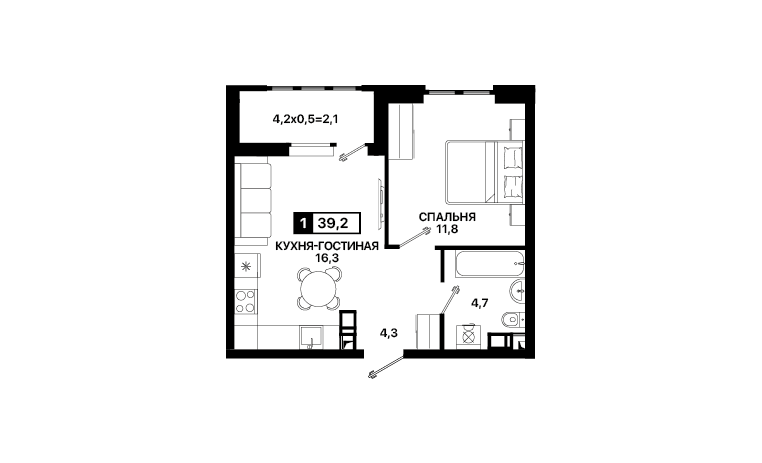 1-комнатная квартира 39,2 м2