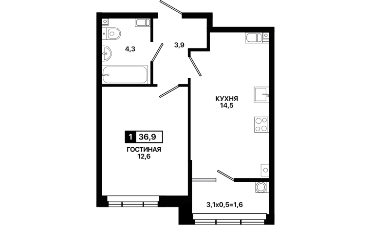 1-комнатная квартира 36,9 м2