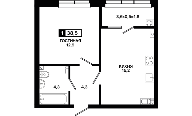 1-комнатная квартира 38,5 м2