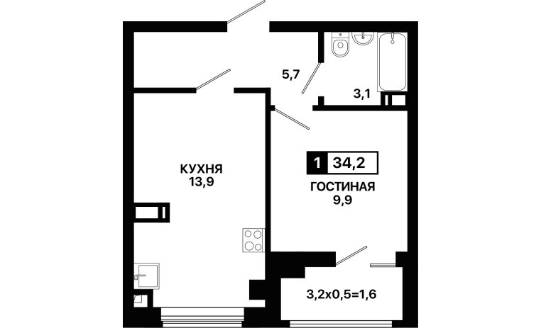 1-комнатная квартира 34,2 м2