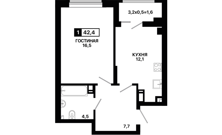 1-комнатная квартира 42,4 м2