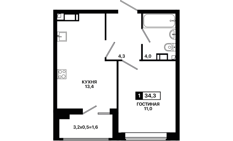 1-комнатная квартира 34,3 м2