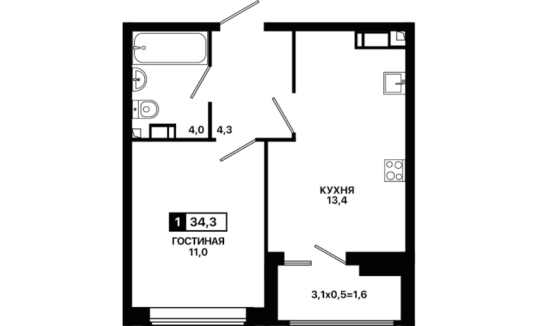 1-комнатная квартира 34,3 м2