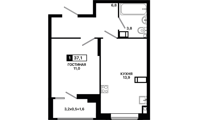 1-комнатная квартира 37,1 м2
